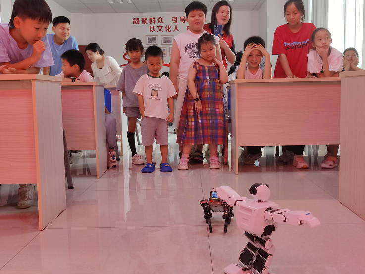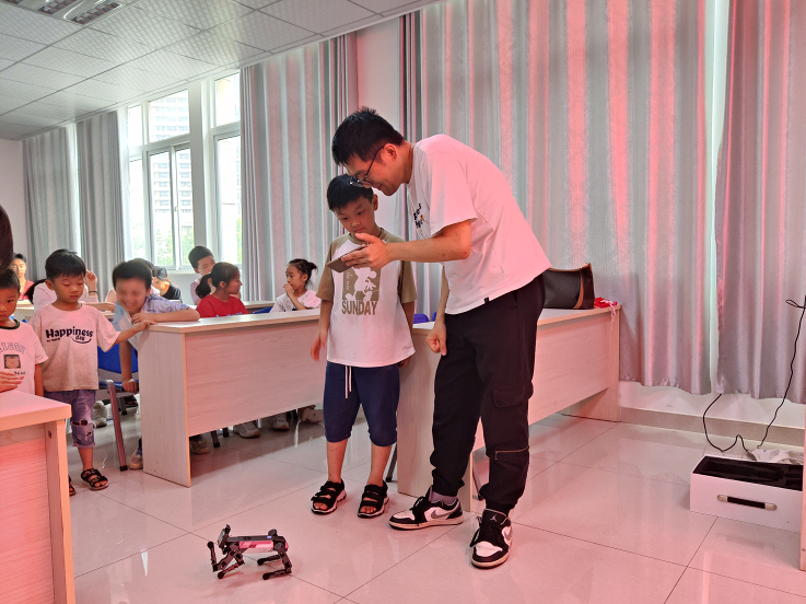 科普讲座之后,徐恒老师组织同行的学生党员共同向翡翠社区小朋友们进行机器人跳舞,机械狗动态模拟展示,在科技作品演示环节,志愿者邀请孩子们一起现场演示学院科技创新作品平衡车和循迹小车,孩子们在参与中体会到了电子机械的魅力。