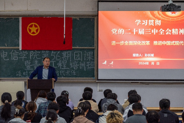 团课第四讲,学院党委书记孙长城带领学员们深入学习了党的二十届三中全会精神,引领同学们深入学习党中央进一步全面深化改革、推进中国式现代化决定的重要意义,对青年提出要求并鼓励青年担当起时代的大任。