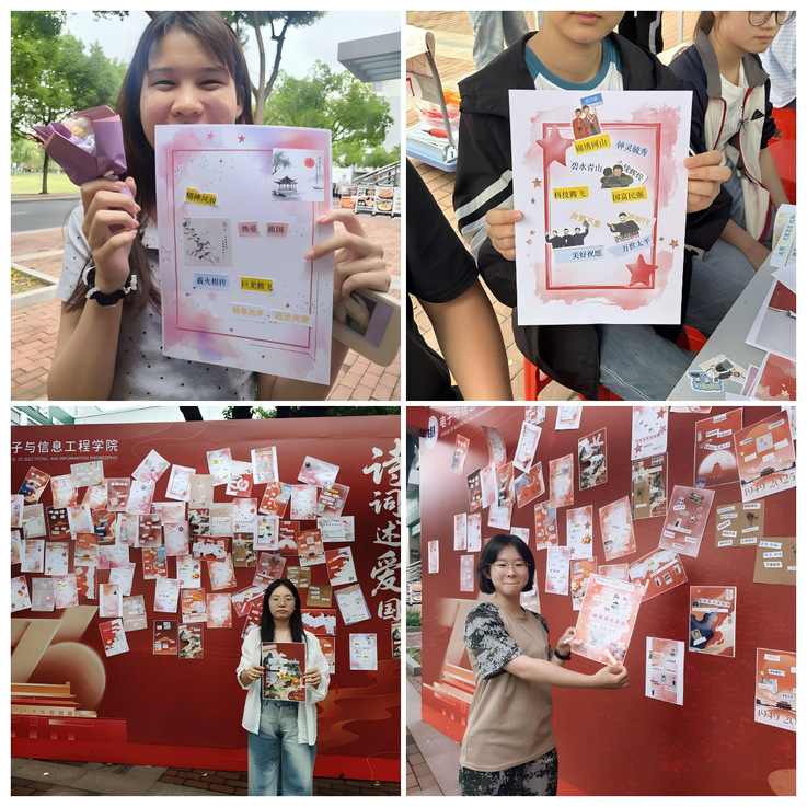 本次活动以“诗词述爱国・笔墨映山河”为主题,创新采用“拼贴诗” 形式,将国庆的庄重意蕴与诗歌的文学之美、传统文化的深厚底蕴紧密结合。活动现场精心准备了印有经典爱国诗句、山河意象(如 “长城”“黄河”“江南”)、时代发展关键词(如 “科技兴邦”“生态文明”“乡村振兴”)的词句碎片。此次活动形式新颖,内容丰富,吸引了众多师生驻足,更得到了领导和老师的充分肯定。