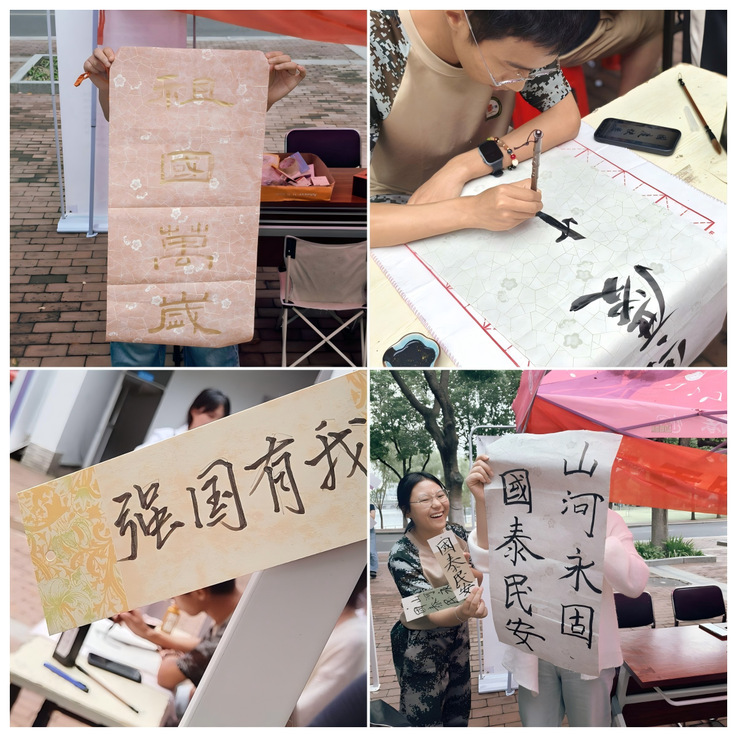 所有完成的拼贴诗统一粘贴至活动大展示板上,原本空白的展板逐渐成为一幅兼具艺术感与文化内涵的“爱国诗词长卷”。现场特设的毛笔字展示区同样人气高涨,学院前期选拔招募的多名志愿者挥毫泼墨,将“国泰民安”“山河无恙” 等祝福与 “人生自古谁无死,留取丹心照汗青”等经典爱国诗句跃然纸上。留学生们纷纷驻足观看,有的还在志愿者指导下尝试握笔书写,感受汉字笔画间的韵律与力量。有的留学生在写下“中国” 二字后兴奋地说:“毛笔字像一幅小型画作,能亲手书写中国文字,让我更贴近中华文化。”