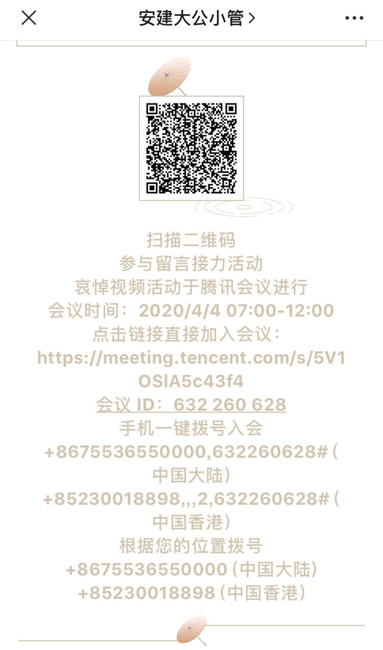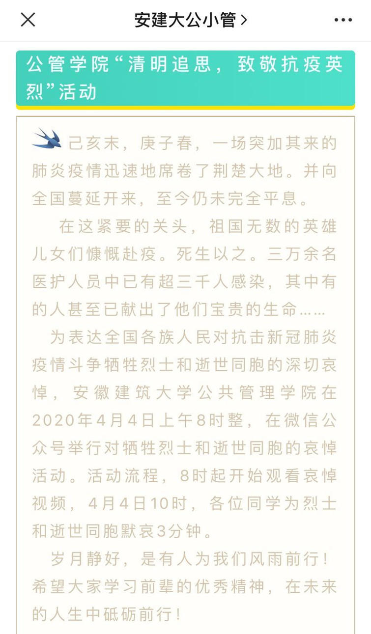 本网讯  国旗半垂,举国同悲。44日,庚子年清明节,公管学院举行线上哀悼活动,一起深切悼念抗击新冠肺炎疫情斗争牺牲烈士和逝世同胞。公管学院全体学生参与此次活动。