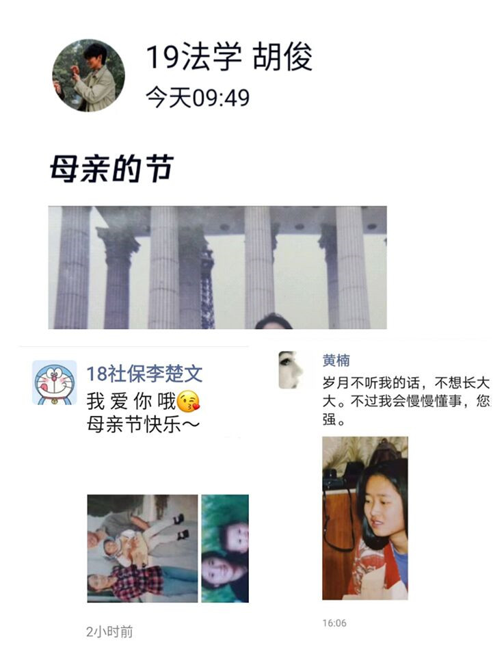 “岁月中的我已经长大,时光却标记了母亲的白发”18社保专业黄楠同学写下自己的心情,向母亲表达感激,字里行间满满的爱和心疼;19级劳动与社会保障专业的王子涵下厨为母亲做了一顿午餐,感谢母亲无私的奉献。还有很多同学分享了母亲年轻时靓丽的照片,回忆母亲为家庭的付出。