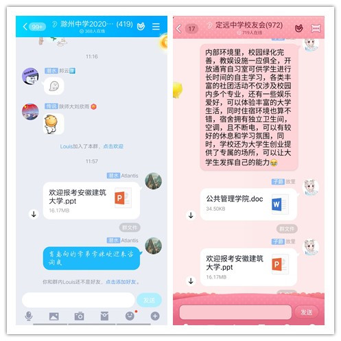 同时,大学生宣传线上志愿队伍、示范高中在校生线上志愿队伍,通过QQ、微信等新媒体平台,进入高中母校毕业班群,通过班主任—毕业班—学弟学妹开展宣传工作,发放电子版宣传资料,全面开展宣讲。对于专业填报、录取分数、就业前景等问题一一做出解答,得到考生与家长的一致好评。