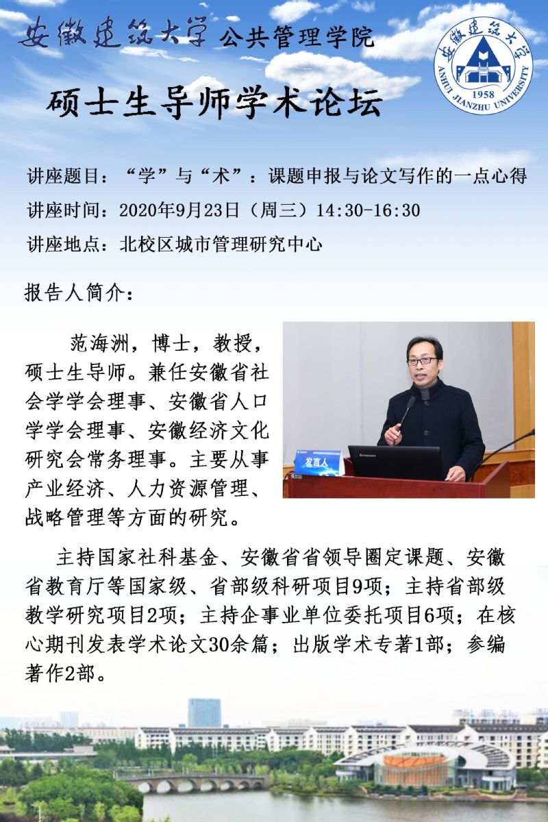 本网讯  923日下午,公共管理学院首届“硕士生导师学术讲座”在北校区安徽省城市管理研究中心D301教室正式拉开帷幕,公管学院全体硕士研究生参加学术讲座。城市管理研究中心副主任范海洲教授担任本次主讲嘉宾,讲座主题《“学”与“术”:课题申报与论文写作的心得体会》。