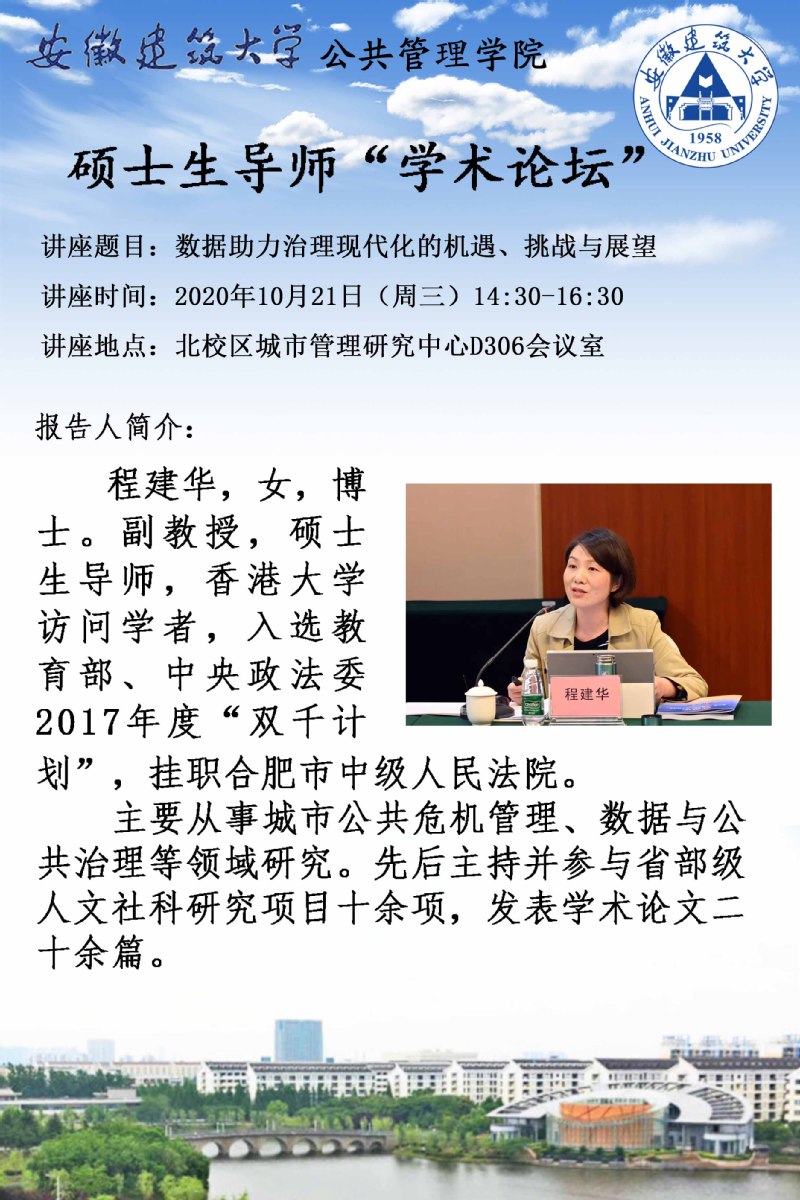 本网讯 10月21日下午,公共管理学院首届“硕士生导师学术讲座”第二讲在北校区安徽省城市管理研究中心举行,全体研究生参加。程建华博士担任主讲嘉宾,讲座主题《数据助推治理现代化的机遇、挑战与展望》。