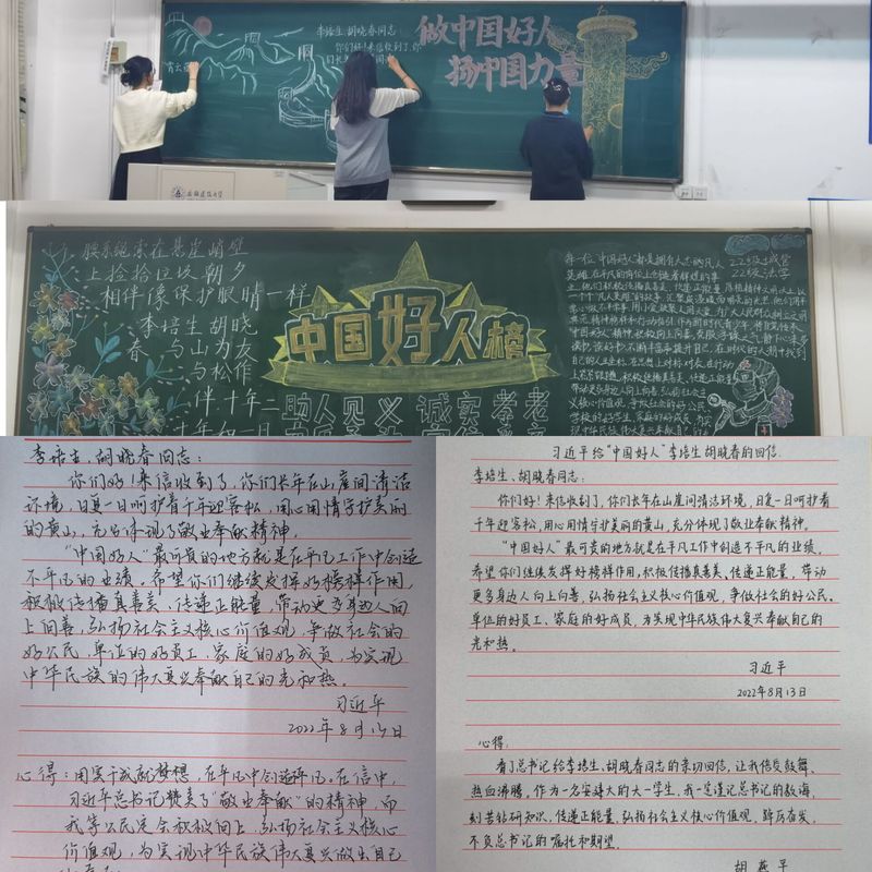 活动中,新生通过誊写习近平总书记回信内容深化学习,撰写心得体会,表达对榜样的敬佩之情;新生各班级的“学习好人精神,争当时代先锋”主题黑板报设计,内容丰富、主题鲜明、布局美观、图文并茂,体现当代大学生对“好人精神”的敬佩之情和传承之行。