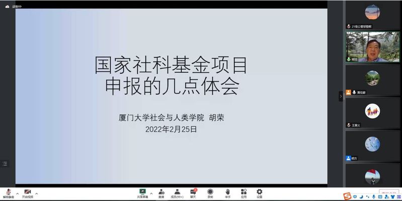 本网讯  进一步推进学院国家社科基金项目申报工作,提高学院师生科研创新能力,公管学院于11月9日线上举办了公共管理高峰论坛(第2期)。本次论坛邀请了教育部特聘教授、国家社科基金会评专家、厦门大学社会与人类学院院长胡荣教授做题为“国家社科基金项目申报对话与分享”的学术讲座。学院教师、研究生以及内外兄弟院校师生共200余人参加。论坛由院长黄佳豪主持。