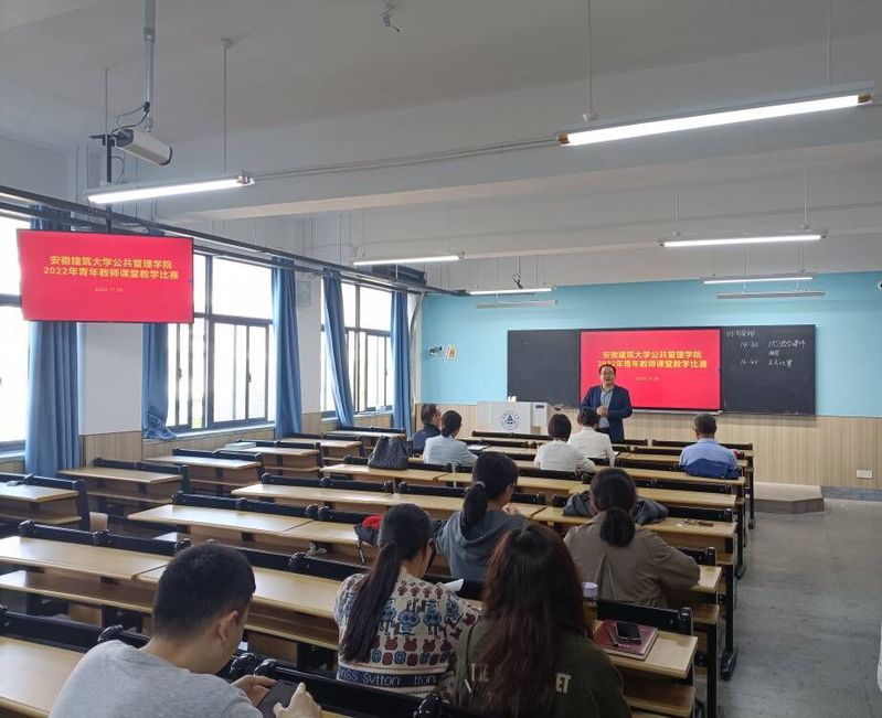 本网讯  为持续加强师德师风建设、锤炼青年教师教学基本功,公管学院2022年11月9日在F512智慧教室组织开展青年教师课堂教学比赛。比赛邀请合肥工业大学于宝证教授、安徽医科大学李菲菲教授、我校督导组李齐全教授和许海燕教授、学院组织员李道先等教学专家担任评委,学院副院长连瑞瑞主持会议,二十多位青年教师参加活动。