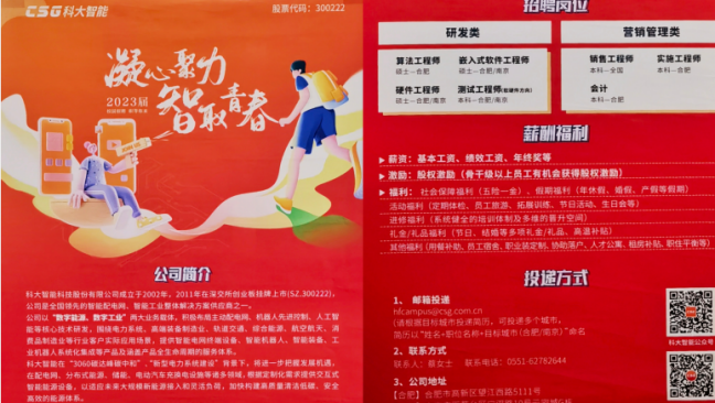 公管学院就业实习基地签约单位教学合作单位科大智能科技股份有限公司受邀宣讲工作人员通过PPT展示以及宣传视频向参会同学介绍了公司发展历程业务板块岗位设置、薪资福利等在互动中对学生进行了就业指导职业发展规划服务此次用人单位提供人力资源管培生实施工程师营销管培生岗位,毕业生现场投递简历,积极与招聘人员沟通、邀约面试,现场气氛活跃