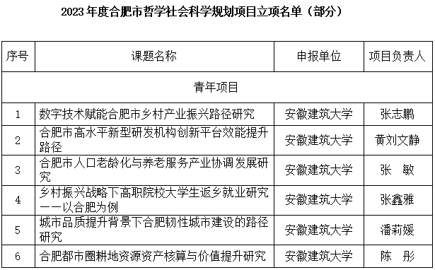 本网讯  近日,合肥市哲学社会科学规划办公室公布了2023年度合肥市哲学社会科学规划项目立项名单,公管学院研究生获立6青年社科规划项目,全省立项总数的11%,是前三年学院立项数之和。