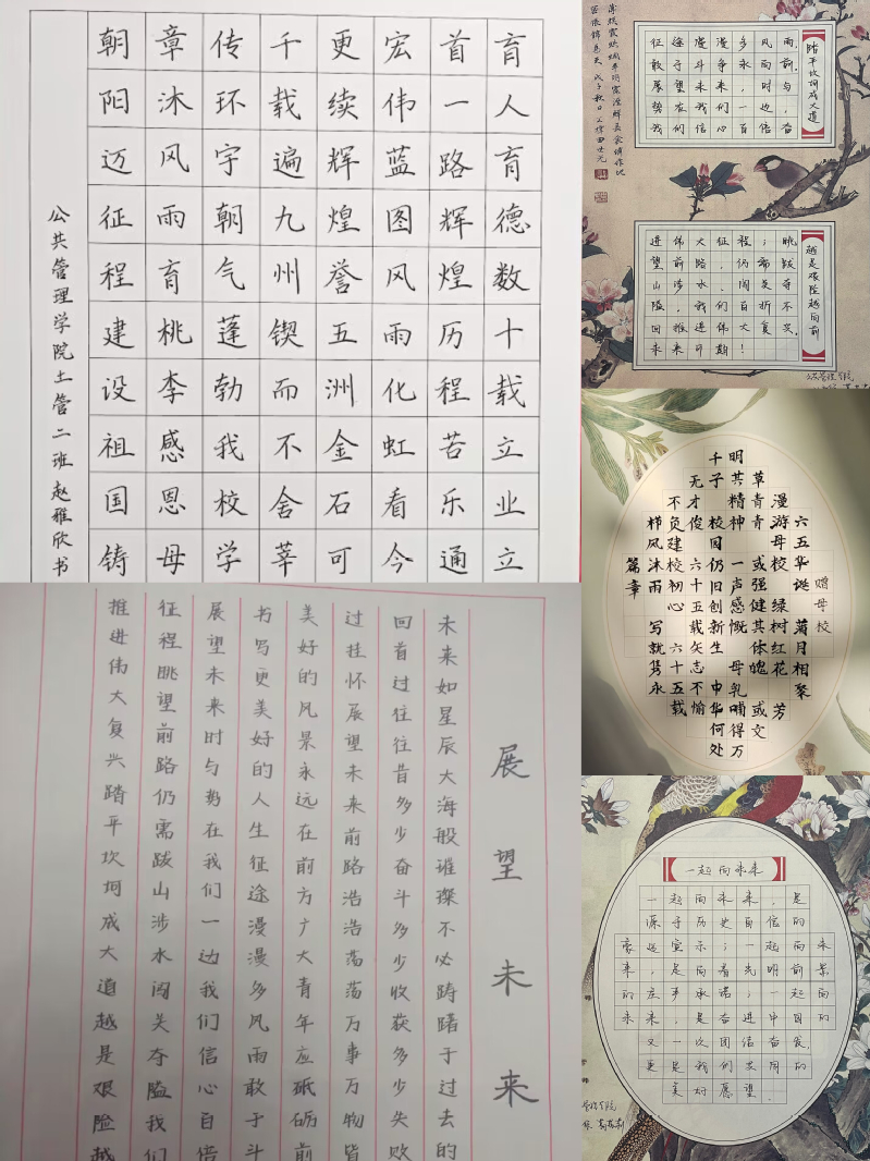 书法比赛内容为优秀古今经典文学作品、原创校庆祝福文章等。通过层层选拔共遴选出37副作品参加此次决赛。同学们满怀热情地书写着对书法的热爱、对母校的祝福字迹或劲健、或婉转或如婀娜窈窕的女子、或如矫健勇猛的壮士或如春风拂面繁花一片,或如北风入关深沉冷峻一幅幅赏心悦目的硬笔书法作品展示着同学们深厚的书法功底经评审,2022级土管专业赵雅欣、21级公共管理专业研究生唐桉和陈彤荣获一等奖;2022级人力专业李诗迪、22社保任程程和崔冰冰等6人荣获二等奖;2022级法学专业张宝怡、2022级城管专业、2021级公共管理学院研究生李睿等9人荣获三等奖。