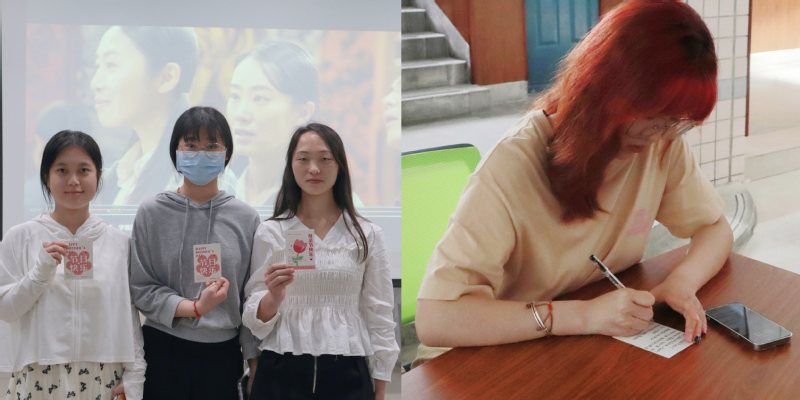 致敬“影片定格岁月,致敬母亲韶华”观影活动。在影片《你好,李焕英》片头曲响起前,参与此次活动的同学们已经领到信纸和贺卡。三俩好友时而安静观看影片,时而分享观影感受。这部精彩的亲情电影,述说着几代人不变的母爱情深,影片落幕时更有几位学生潸然落泪。之后,大家将一直未对母亲表达的感激与爱意,写入节日卡片和家书之中。