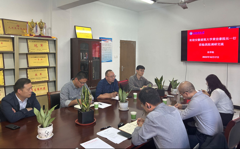 公管学院一行首先来到安徽财经大学法学院,调研学习法律硕士申报的先进经验。法学院副院长高海(主持工作)、副院长纵博、副院长赵新龙等相关人员参与研讨会上,高海介绍了法学院的基本情况、专业设置和学科点的建设情况;黄佳豪介绍了公管学院的办学历史专业设置等简况。双方就法律硕士点申报工作、法学学科和科研平台建设等进行了深入的探讨和交流。