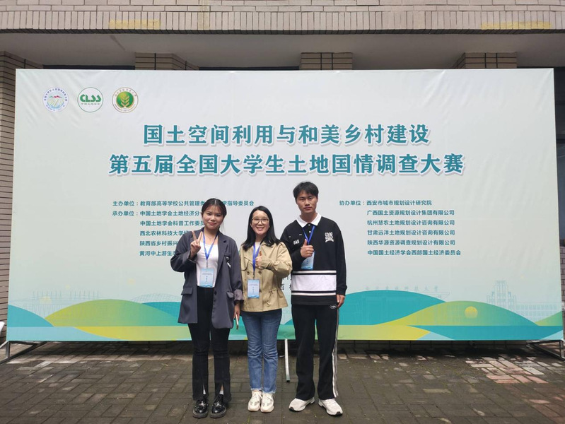 公共管理学院21级土地资源管理专业常凯、王仟骥、朱倩倩、高科、鲁晨,21级地理信息系统专业汪乐怡,在土管系教师张童博士、王玉纯博士的带领下参加比赛,经过校赛、国赛初评等环节,最终荣获全国总决赛三等奖。