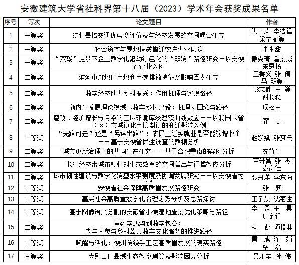 本网讯  丹桂飘香秋意浓,金秋时节硕果丰。近日,安徽省社科联公布了第十八届(2023)学术年会获奖成果名单,学校获奖17项,占全省获奖总数的11.3%,一等奖3项、二等奖13项、三等奖1项。其中,公管学院共获一等奖、二等奖11项。
