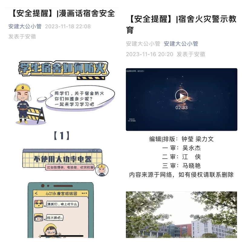 为推动安全教育工作取得实效,实现安全教育工作全覆盖,学院通过“安建大公小管”新媒体平台,定期推送安全教育相关知识与法律法规,保障学生身体健康与生命财产安全,着力杜绝事故苗头隐患,夯实平安校园建设基础。