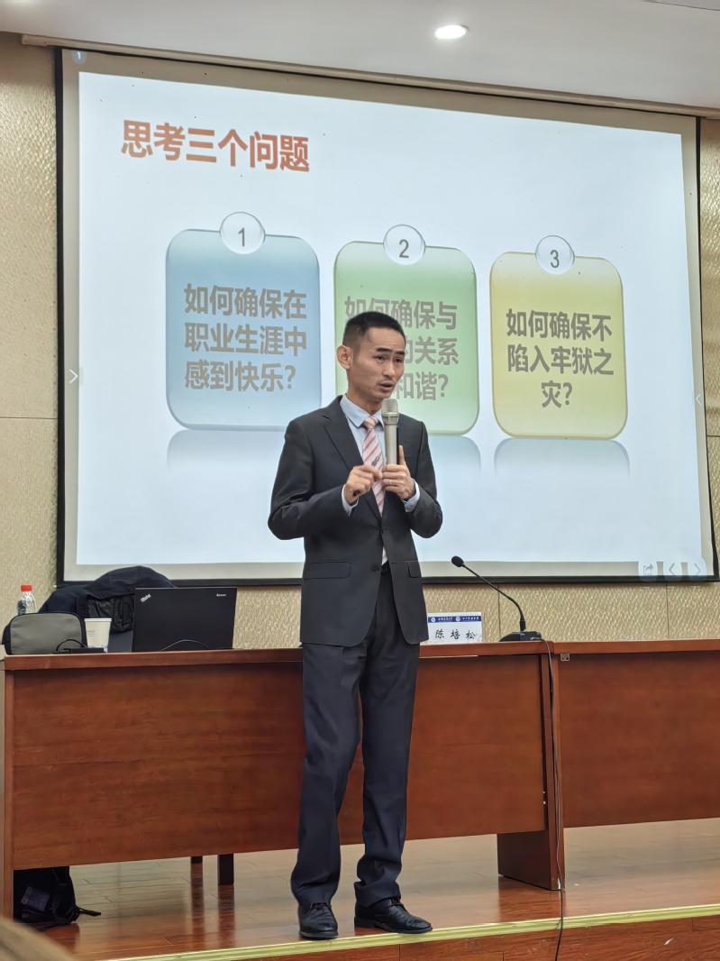 讲座中,陈培松首先从“如何确保在职业生涯中感到快乐?”“如何确保与家人的关系幸福和谐?”等问题导入,循序渐进的引导学生思考并建立职业规划意识雏形。他勉励学生们在大学生活中积极主动参与学院各项活动,在实践中探索出崭新道路。