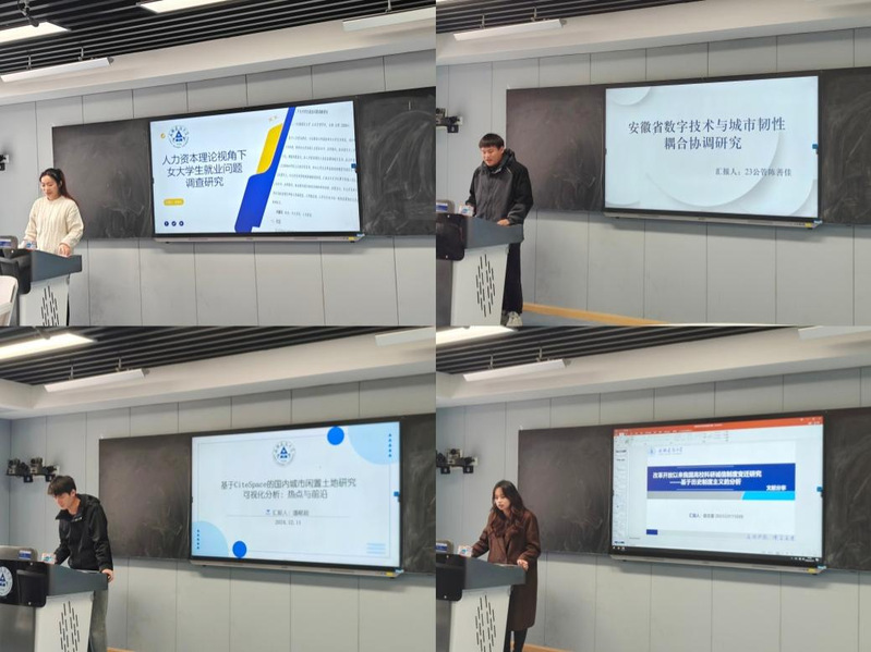 安志云以《人力资本理论视角下女大学生就业问题调查研究》为题,基于人力资本理论,分析女大学生的人力资本积累水平、求职状况、以及就业现状,通过多维度的视角全面审视女大学生就业所面临的挑战,并据此提出针对性的解决策略与建议;陈善佳以《安徽省数字技术与城市韧性耦合协调研究》为题,采用熵值法和耦合协调度模型等分析工具,深入探究数字技术与城市韧性之间复杂而微妙的耦合协调关系;潘献超以《基于Cite Space的国内城市闲置土地研究可视化分析》为题,运用信息可视化的研究手段,将闲置土地领域的研究成果作为核心考察对象,深入探索并分析该领域内的研究热点与前沿趋势;查志蕙以《改革开放以来我国高校科研诚信制度变迁研究》为题,从结构观、历史观及动力机制这三个不同视角出发,考察我国高校科研诚信制度变迁的制度逻辑,探索高校科研健康发展道路。