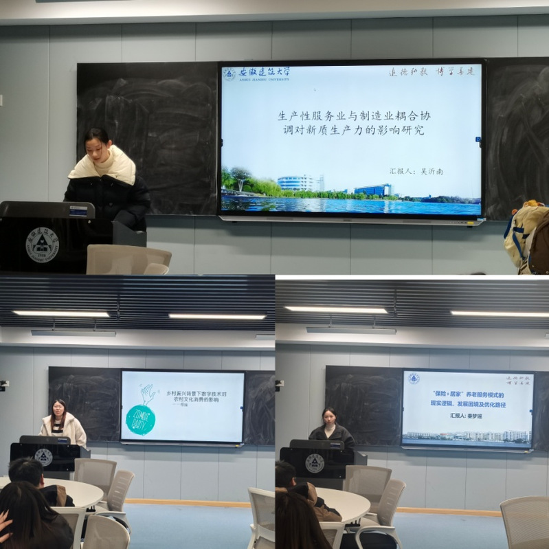 在汇报环节,吴沂南以《生产性服务业与制造业耦合协调对新质生产力的影响研究》为题,揭示了生产性服务业与制造业的耦合协调对新质生产力有显著正向影响,强调区域差异性及产业升级的必要性,为区域经济发展提供了新的研究视角;韩宝艳以《乡村振兴背景下数字技术对农村文化消费的影响》为题,以CGSS 2021数据探讨了数字技术如何积极影响农村文化消费,并提出加强农村数字建设的策略;秦梦瑶以《“保险+居家”养老服务模式的现实逻辑、发展困境及优化路径》为题,研究了“保险+居家”养老服务模式的现实逻辑与发展困境,并提出了相应优化路径。