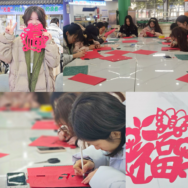 每一次落剪,每一道折线,都倾注着同学们对传统文化的尊崇与热爱。虽初涉剪纸,手法稍显稚嫩,但活动现场热情洋溢,众人在实践中充分领略剪纸艺术的独特韵味。他们神情专注,眼神中透露出对传统艺术的热爱与敬畏。不仅体验到了剪纸艺术的魅力,更在动手实践中培养了耐心与专注力。他们相互交流、相互学习,共同探索剪纸的奥秘,最后,一幅幅剪纸作品逐渐成型。从古朴的传统图案到融合现代创意的新颖设计,同学们在纸间精雕细琢,深度感受非遗文化底蕴。