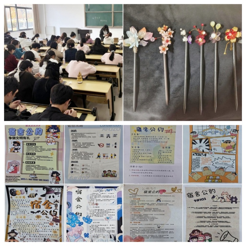 公管学院聚焦学生实践动手能力和院内劳动常态化机制建设,以传统文化和学风建设、宿舍管理为抓手,推出特色鲜明、参与度高、成效显著的劳动实践平台。其中,朝含国学社联合校青年志愿者协会共同举办发簪制作活动,为同学们详细介绍发簪的历史背景和制作工艺并分组进行制作,此次活动不仅是一次手工制作体验,更是一次深刻的文化之旅,引导同学们在实践中体悟传统文化的魅力;组织开展“最美笔记”“最美作业”评选活动,为学生们提供了一个展示学习成果的平台,更有助于激发他们的学习热情和创造力,为学院优良学风的建设奠定坚实基础;学院举行宿舍公约设计活动,同学们从学习、生活、环境、作息以及人际交往等多个维度,提出切实可行的建议举措,全方位展示寝室文化、宿舍特色,并建立起有效的寝室规则,营造积极向上的寝室氛围。