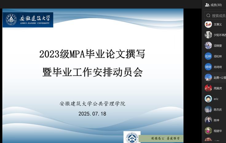 本网讯 为切实提升MPA研究生学位论文质量,规范写作流程,7月18日,公管学院线上召开2023级MPA毕业论文撰写暨毕业工作安排动员会。会议由副院长王秉义主持,院长黄佳豪、2023级MPA研究生及导师参加会议。