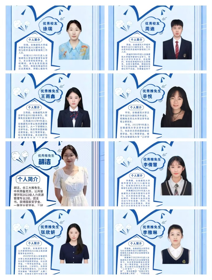 活动第三阶段,优秀校友2026届硕士研究生推免同学结合自身经历分享经验。土地资源管理专业邀请本专业优秀本科生张欣妍,分享学习生活经历与保研心得;城市管理专业邀请优秀校友周迪、徐瑞、李倩慧,分享专业课学习、考公考研经验,叮嘱新生珍惜大学时光;劳动与社会保障专业邀请22级优秀推免生李雅琳,从方向选择、课程学习、实践积累、心态调整四方面,分享学业规划与推免经验;人力资源管理专业邀请22级推免至合肥工业大学的胡洁同学,分享高效学习、科研竞赛参与及大学生涯规划的成长心得;法学专业邀请22级推免生王雨鑫、辛悦同学,讲解保研准备、学业积累要点与推免流程,传递正能量。