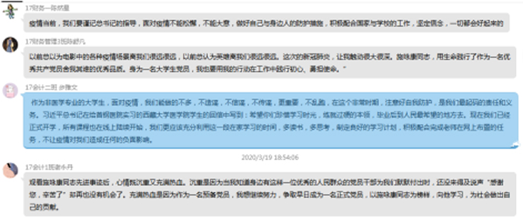 一个时代的精神是青年代表的精神,一个时代的性格是青春代表的性格。线上学习后,每位党员在线上进行了热烈的议论并发表感想,“习近平总书记在信中鼓励同学们珍惜学习时光,练就过硬本领,到人民最需要的地方去,以仁心仁术造福人民。一封回信,不仅是总书记对17名医学生的殷切寄语,更坚定了广大医护人员与全国人民战胜疫情的信心与决心,表达了对广大青年学子的期许和厚望。”支部党员张鸿影激动地说。“我们已长大,可以接下这一棒!我们是勇往直前的90后,不负党的期待,人民重托,不负这个伟大时代。”支部党员杨秀轩读完回信后真情流露。