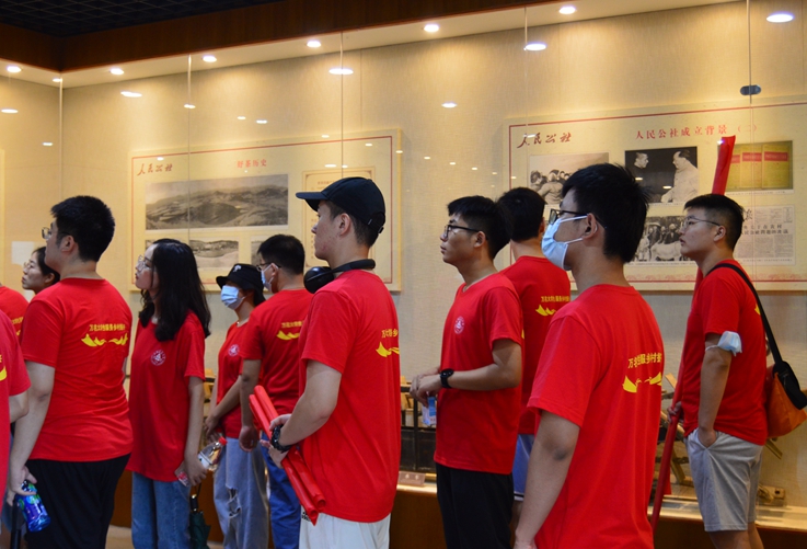 在毛主席视察舒茶纪念馆,实践团成员满怀敬意地瞻仰毛主席全身铜像,认真聆听讲解员讲述毛主席视察舒茶人民公社的历史,实地参观“九一六”茶园,远望青岗云梯,对毛主席考察期间那句“以后山坡上要多多开辟茶园”的号召深有感悟,重温党的革命路线,追寻党的红色脉动。