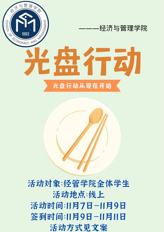 本网讯 践行光盘行动,倡导舌尖文明。为提倡同学们珍惜粮食,学习勤俭节约精神,养成文明用餐的良好风气,培养健康文明的餐饮文化,经管学院于近日开展光盘行动主题活动。