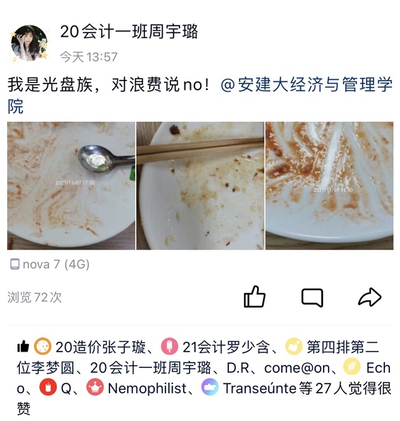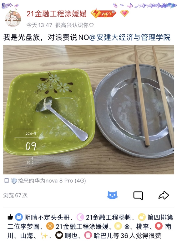 此次活动主要以线上报名宣传的形式,通过今日校园第二课堂和经管学院官方QQ空间对学生进行宣传动员。活动期间,同学们积极参与,记录并发表了自己拍摄的餐后空盘照片,通过实际行动表明了自己厉行勤俭节约,反对铺张浪费的决心。