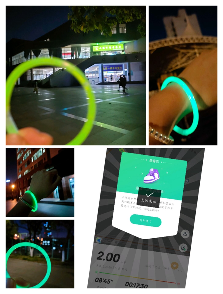夜跑活动共设立了七处打卡点,参与者只需在其中任意四处进行拍照打卡即可完成。活动没有形式限制,快跑、慢跑皆可,伴随一声开跑口令,参与者们戴着荧光眼镜、荧光发卡,手中挥舞着各色荧光棒,一场与青春同行的荧光夜跑就此开始。随着同学们的脚步,校园里逐渐亮起了点点荧光,校园被装点成一个星光闪耀的欢乐海洋,涌动的人群在校园内形成了一道道亮丽的风景线。在终点处,工作人员还为完成跑步的同学们准备了学院的专属吉祥物贴纸和书签。