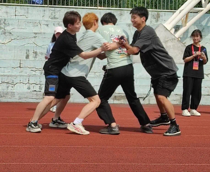 碧空万里,清风破暑。操场上风和日丽,正是运动的好时节。本次户外体育活动共有四个环节,同舟共济、四人进击、滚雪球和听歌识曲,选手们需要和队友团结合作,在混乱的纸堆中找到写有“同舟共济”四个字的纸片并完成拼图,用身体当做“城墙”防止对方将沙包投入自己的箱子里,手拉手绕过标志物合力完成往返跑,通过歌曲的前奏和声音快速说出歌名。四个环节各具特色,吸引了众多学生参与,运动场上活力四射,加油声、欢笑声、掌声响彻整个操场。