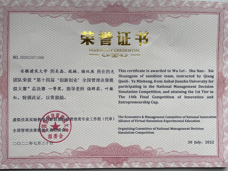 本网讯 日前,2022年第十四届“创新创业”全国管理决策模拟大赛总决赛落下帷幕。经过校赛、大区赛、大区复活赛、全国半决赛、总决赛激烈角逐,学院强群莉和叶敏红指导,吴磊、疏楠、谢双燕三人组成的“光”团队从128个参加全国总决赛的代表队中脱颖而出荣获全国总决赛一等奖。