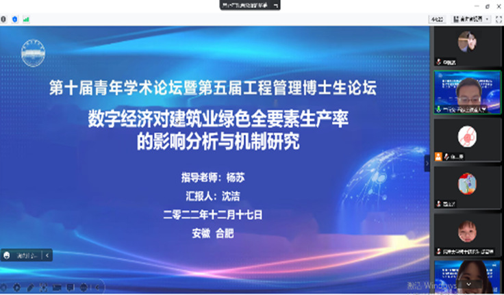 本网讯 2022年12月17日,中国建筑学会工程管理研究分会第十届青年学术论坛在合肥工业大学召开,大会以“智能建造的管理理论与技术”为题,来自全国百余所高校的1000余名工程管理领域专家学者、研究生及企业代表线上参会。我院章蓓蓓副院长和研究生沈洁受邀参会。
