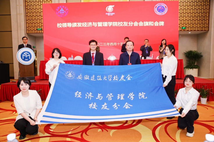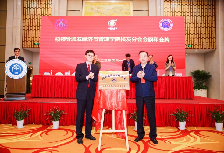校党委常委、副校长蔡新立和学院党委书记、校友分会会长陈国中共同为经济与管理学院校友分会揭牌,蔡新立为经济与管理学院校友分会授旗。校友分会会长、副会长、秘书长、副秘书长上台合影留念。