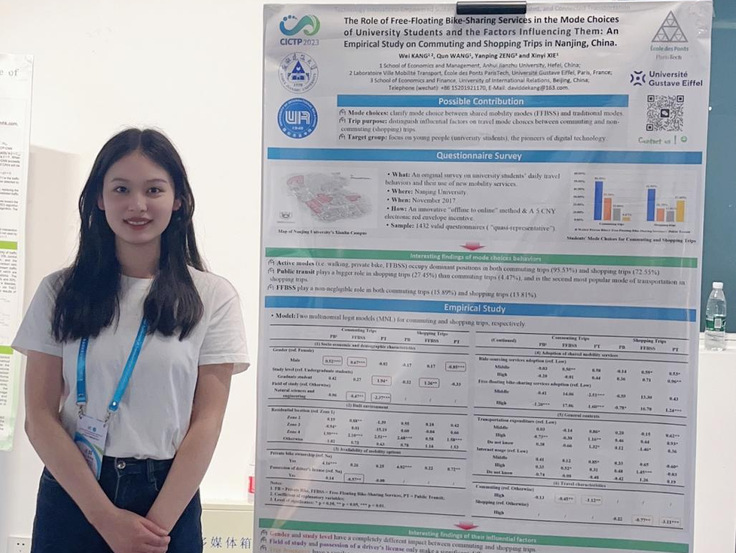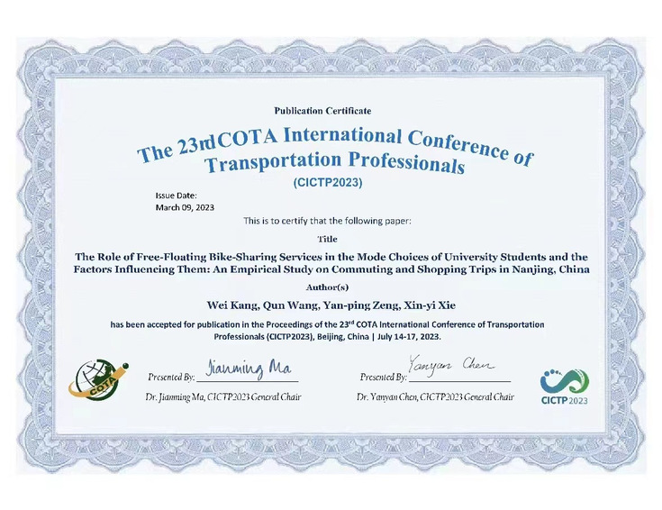 康玮博士作为第一作者与其指导的研究生王群以及国际关系学院曾燕萍副教授、美国威斯康星大学麦迪逊分校硕士生谢昕怡合作撰写的论文《The Role of Free-Floating Bike-Sharing Services in the Mode Choices of University Students and the Factors Influencing Them: An Empirical Study on Commuting and Shopping Trips in Nanjing, China(共享单车在出行模式选择中的角色及其影响因素:以中国南京大学生通学与购物出行为例)》被本次会议论文集The Proceedings of the 23rd COTA International Conference of Transportation Professionals收录(EI检索)。并受邀在Spatiotemporal Behavior, Accessibility and Mobility Issues of The Urban Vulnerable Groups(城市弱势群体的时空行为、可达性与机动性问题)分论坛进行Poster Presentation(墙报展示)交流。