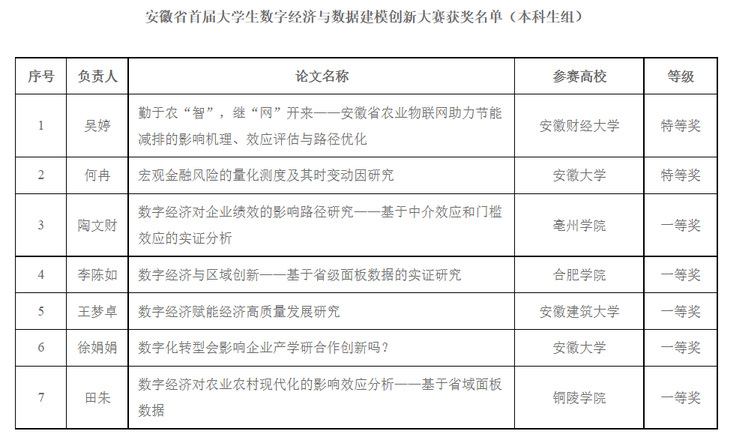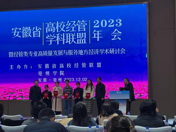 本网讯 2023年12月2日,由安徽大学主办的安徽省首届大学生数字经济与数据建模创新大赛现场赛在亳州学院承办的安徽省高校经管学科联盟2023年会会议期间圆满落下帷幕。经过激烈角逐,经管学院王梦卓(本科生组)、何慧娴与王开林(研究生组)团队从105支参赛队伍中脱颖而出,荣获省赛一等奖。