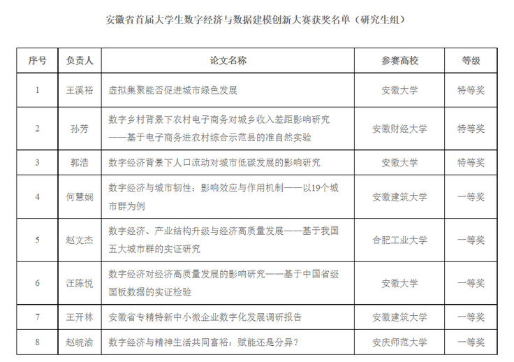 学院学子在本次大赛中取得佳绩,充分展现了学院学生的思维能力和创新能力,也体现了我校在人才培养方面取得的成果。下一步,学院将继续贯彻习近平总书记关于数字经济的重要指示,通过组织各类活动和加强教育,为学生搭建提高创新能力的平台,提升学生综合素质,助推安徽数字经济人才培养。(图/文:李娜娜,王梦卓;审稿:彭志胜)