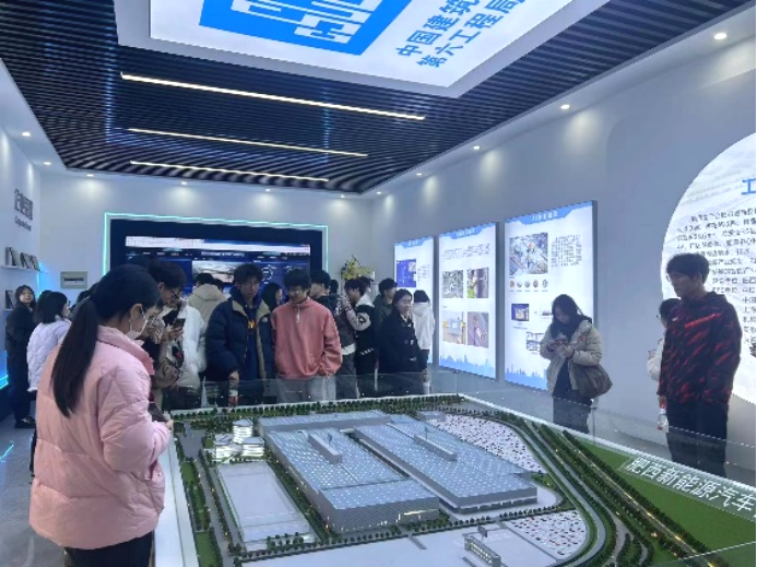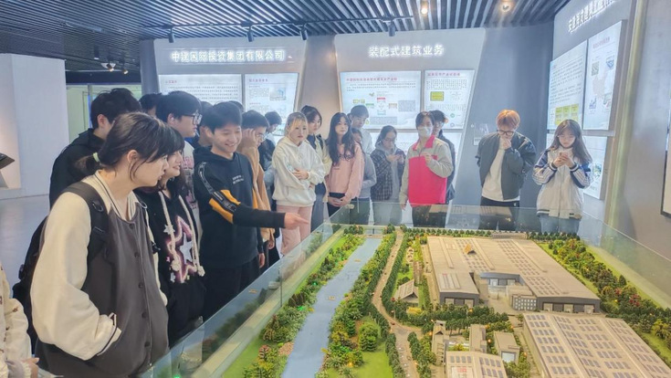 在中建六局第八建设有限公司,师生一行首先通过参观建筑工业化现场,了解现代化的工程项目规模、进度管理、质量控制、材料管理等方面的具体情况。随后在技术人员的带领下参观了各式技术展厅,亲身体验了技术设备和先进工艺,深入了解现代建筑工业化的先进水平。