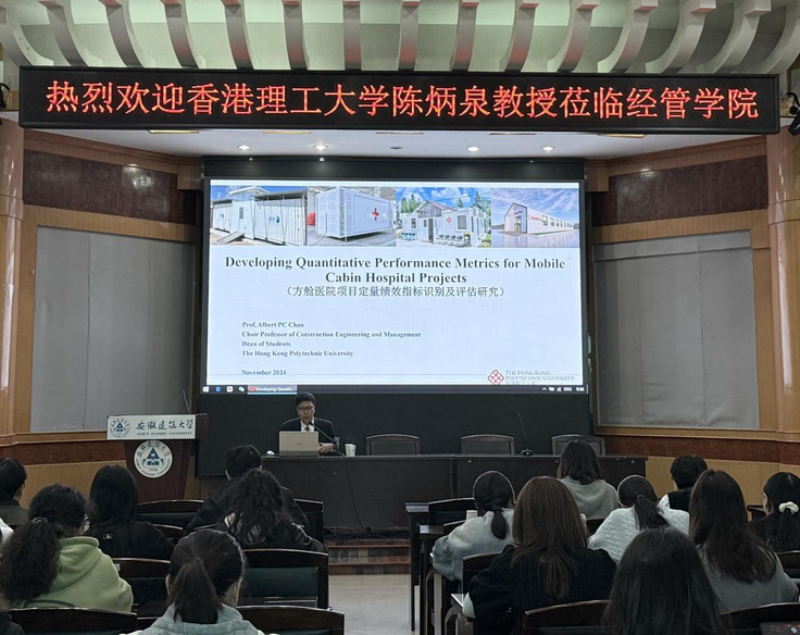 本网讯 11月11日,香港理工大学陈炳泉(Albert Chan)教授应邀到经管学院举办题为“Developing Quantitative Performance Metrics for mobiles Cabin Hospital Projects”(方舱医院项目定量绩效指标识别及评估研究)的专题讲座。讲座由经管学院副院长章蓓蓓主持,学院教师、硕士研究生共80余人参加。