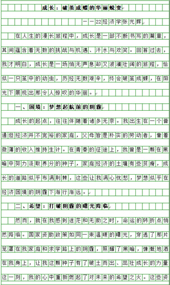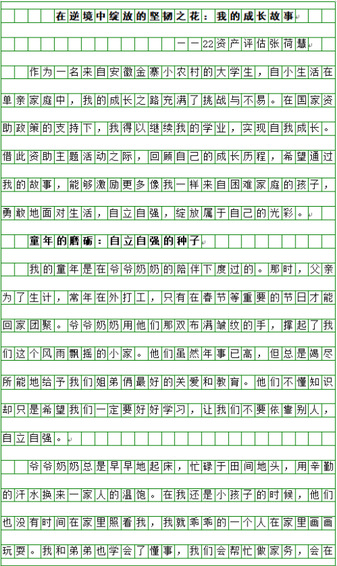 主题活动得到了同学们的积极响应和广泛参与。参加活动的同学以细腻的笔触描述自己从懵懂的大一新生到成长为学生骨干获得各类荣誉的过程,分享自己成长中的酸甜苦辣和对自己过往成绩的总结,既有对成长的感悟也有对国家资助的感激之情。