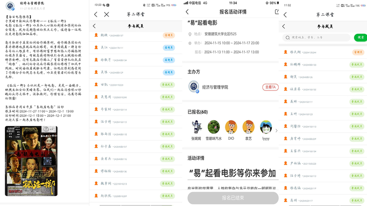 在观影过程中,同学们被影片中的人物形象和故事情节深深打动,时而为角色的坚韧不拔而感动落泪,时而为影片中的英勇事迹而热血沸腾。每场观影结束后,易班工作站都组织了深入的讨论环节,鼓励同学们分享自己的观影心得和感悟,促进了彼此之间的交流与理解。除了观影活动外,易班工作站还充分利用线上平台,发布了观影季的精彩瞬间、幕后花絮和影评文章,吸引了更多学生的关注和参与。