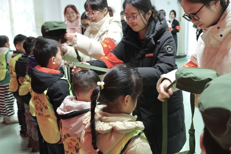 本网讯 3月4日,在第62个 "学雷锋纪念日" 来临之际,受三里街街道团工委、临淮路社区党委、临淮路社区团支部邀请,经济与管理学院 "菁琯" 青年志愿者服务队15名队员走进合肥瑶海三心幼儿园,通过 "故事讲述+仪式教育+劳动实践" 三位一体模式,为30余名学龄前儿童带来沉浸式雷锋精神教育体验。