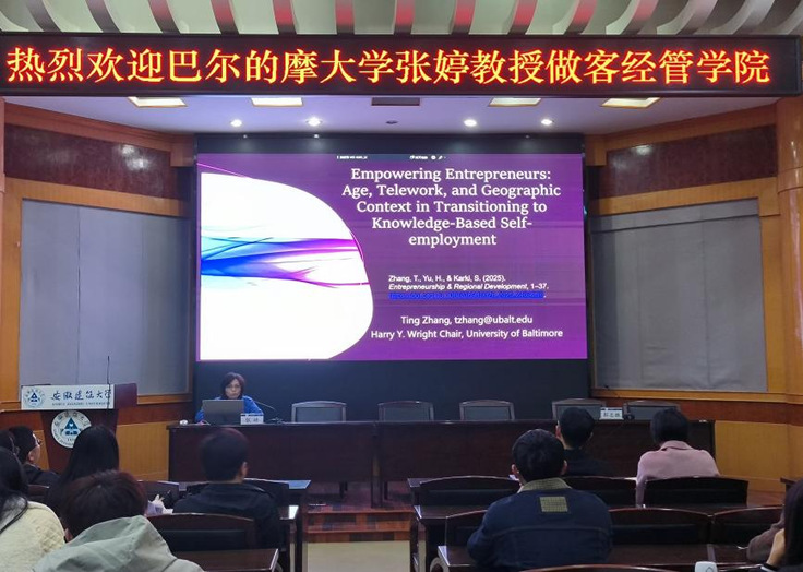 本网讯 3月21日,美国巴尔的摩大学张婷(Ting Zhang)教授应邀到经管学院举办题为“Empowering Entrepreneurs : Age, Telework, and Geographic Context in Transitioning to Knowledge-Based Self-employment”(赋能未来:年龄、远程与地域在知识型创业转型中的诗意交响)的专题讲座。讲座由经管学院院长彭志胜主持,学院教师、硕士研究生共80余人参加。