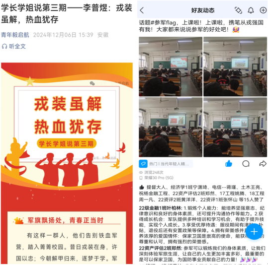 各年级辅导员同步在QQ空间、QQ群打造“征兵宣传”专题,发布政策图解、参军答疑等模块,总浏览量破千次。设计“参军flag”互动话题,吸引多名同学留言打卡。2022级郑同学留言:“参军可以锻炼我们的身体素质,让我们深刻体验军旅生涯,让自己的人生更加丰富多彩,最重要的是可以保家卫国,为国防事业贡献自己的力量!”微信公众号则通过退伍学生专访进一步宣传火热的军营生活和包河区征兵政策,实现了征兵工作线上宣传全覆盖。