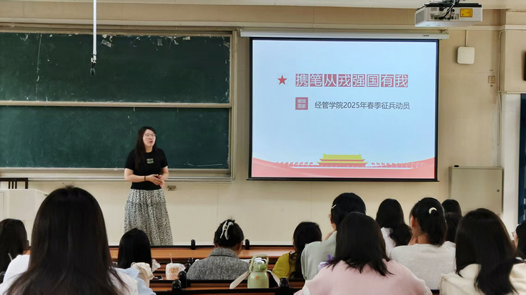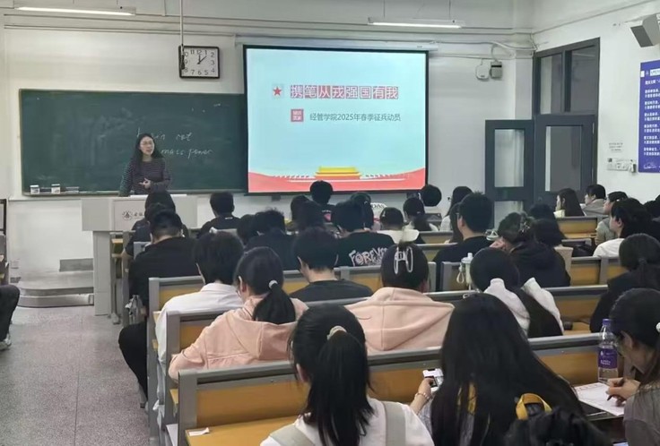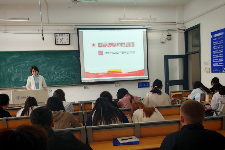 本网讯 为响应国家号召,落实学校2025年征兵工作动员会精神,近期,经济与管理学院组织各专业年级开展“携笔从戎 强国有我”征兵宣传教育系列活动,通过主题班会、退役士兵宣讲、网络宣传等方式,全方位点燃学子参军热情。