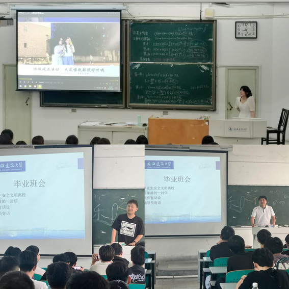 班会上,辅导员充分肯定了毕业生四年来的取得的成绩以及对学院工作的理解支持,表达了对大家的感谢和毕业的祝贺并对毕业季各项工作进行梳理,指导毕业生做好毕业离校相关事宜。同时,聚焦理想信念教育、爱校荣校教育、安全法治教育、诚信感恩教育、心理健康教育等多维度主题对毕业生进行思想政治教育;此外,通过分享学生四年前写给自己的一封信以及观看大学回忆视频等方式引导毕业生对大学生活进行总结,回顾自己在思想、学习和生活等方面的成长经历,教育毕业生珍惜师生之情、同学之谊,珍视大学期间的学习成果,自觉增强自律意识,规范文明行为,做到文明离校“六个不”:不酗酒闹事、不打架起哄、不乱掷杂物、不损坏公物、不乱涂乱画、不违规夜不归宿,现场气氛热烈,同学们纷纷表示一定积极响应号召。
