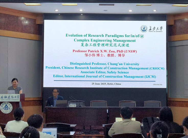 邹小伟(Patrick X.W.Zou),博士、长安大学特聘教授、博导。致力于复杂工程安全、节能与风险管理等领域关键问题、理论和研究方法论的交叉研究,研究成果覆盖广泛,并深度契合国家“安全与双碳”战略。邹教授拥有澳大利亚新南威尔士大学(UNSW)博士学位,曾在澳大利亚多所大学全职从事教学科研工作逾二十年,积累了丰富的国际化教学与科研经验。他曾作为访问教授/学者赴多所著名高校交流,多次担任国际研讨会主席或学术委员会主席,并发表大会主旨报告演讲。目前担任International Journal of Construction Management Editor; Safety Science AssociateEditor 和中华建设管理研究会(CRIOCM)会长。出版多部权威英文专著,发表了200余篇英文论文,研究成果被引用11000余次,h指数达55,连续多年入选全球前2%顶尖科学家榜单,并被评为终身影响力科学家。曾主持和参与多项国家自然科学基金、国家社会科学基金、省部委及企事业单位合作科研项目。曾讲授10余门本硕博课程。获10余项优秀研究、优秀论文、优秀教学和优秀服务奖。