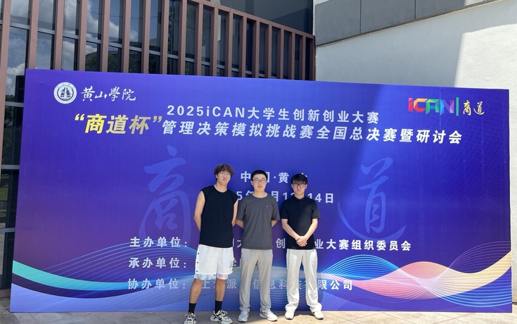 本网讯 7月14日晚,2025iCAN大学生创新创业大赛“商道杯”管理决策模拟挑战赛全国总决赛在黄山学院圆满落幕。我校学子张雨、李志慧、王佳慧组成的“练习生小队”获得全国总决赛二等奖,范颖、申雨欣、戴典格组成的“新颖阁”和张有权、陈永智、汤斌组成的“拉啦队”获全国总决赛三等奖。iCAN大学生创新创业大赛是鼓励原创精神,培养创新思维,提升实践能力的大学生综合性创新赛事,自2007年发起至今,得到了广大青年学生的热爱。2010年,iCAN大赛获批《教育部、财政部关于批准2010年度大学生竞赛资助项目的通知》大学生竞赛资助项目。2023年,iCAN大赛入选《全国普通高校大学生竞赛分析报告》竞赛目录,编号54。